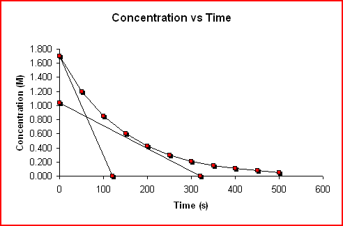 Inst Ratet = 0 s = -Δ [A]/ Δt = -( 0.24 M – 1.7 M)/( 120 s – 0 s) = 0.012 M/s